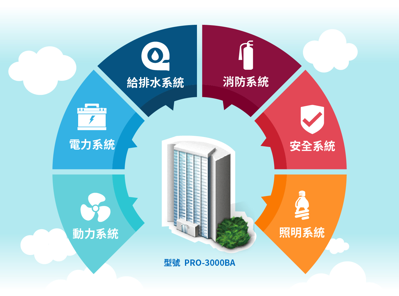 系統、給排水系統、消防系統、安全系統與照明系統集中管理,使之達到一個安全、